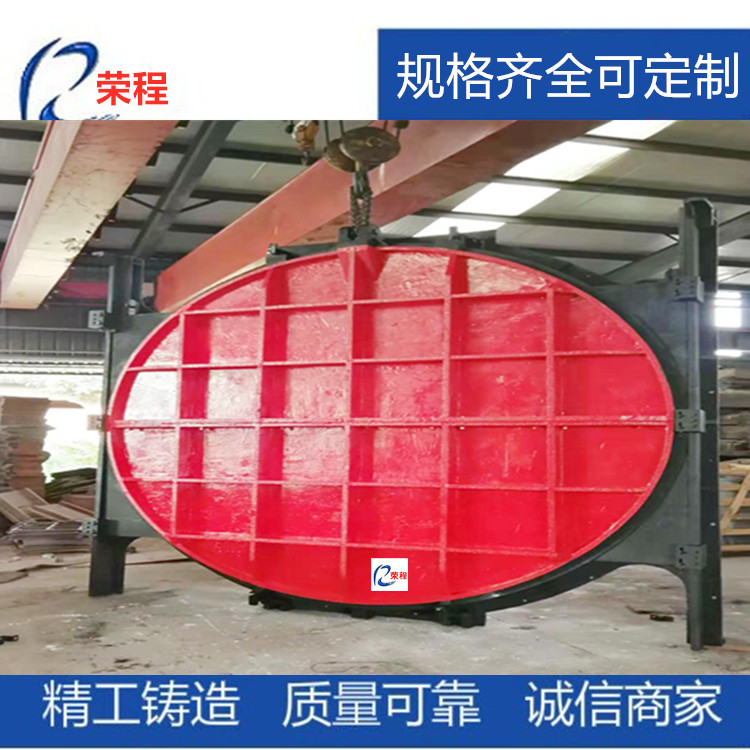 鑄鐵圓閘門是鑄鐵閘門中的一個規格。閘門有方形、圓形,扇形,拱形等。鑄鐵閘門一般由門葉和門框兩部分組成,門體和門框的材料采用鑄鐵,一般整體鑄造和加工。為保證止水效果,止水面可以加以鑲銅合金或不銹鋼等來增加其防腐能力。有特殊要求的地方還可以采用鎳鉻合金鑄鐵等耐腐蝕性更強的材料。
