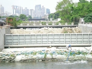 在水利水電建設(shè)中,隨著城市用水、景觀建設(shè)及環(huán)境整治和灌溉、發(fā)電的需要,翻板閘,水閘和橡膠壩得到廣泛的運用。然而,橡膠壩等生產(chǎn)比較復(fù)雜,運行時充水(充氣)升壩或放水(放氣)塌壩時間較長,影響快速截流或泄洪,再加上橡膠易老化的弊端,容易發(fā)生質(zhì)量事故。現(xiàn)在市場上出現(xiàn)大量鋼結(jié)構(gòu)閘門,或翻板閘但無論是提升式或臥倒式,單孔都很難適用較寬的河道。鋼壩閘是一種新型可調(diào)空控溢流閘門,它有土建結(jié)構(gòu)、帶固定軸的鋼閘門門體、啟閉設(shè)備等組成。這種建筑物適合于閘孔較寬(10米~~100米)而水位差比較小的工況(1~~7米),由于它可以設(shè)計的比較寬,可以省區(qū)數(shù)孔閘墩,所以不僅結(jié)構(gòu)簡單,可以節(jié)省不少土建投資,而且可以立門蓄水,臥門行洪排澇,適當(dāng)開啟調(diào)節(jié)水位,還可以利用閘門門頂過水,形成人工瀑布的景觀效果。